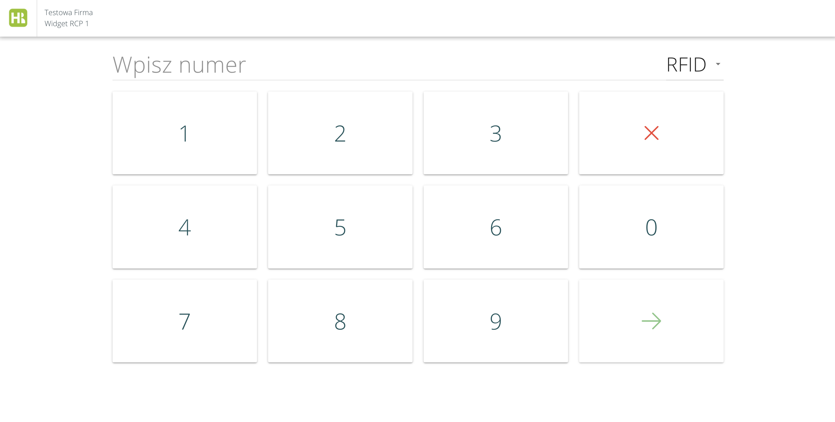 Pracownik będzie mógł na widgecie wpisać swój numer identyfikacyjny lub zeskanować kartę RFID, aby rozpocząć rejestrację czasu pracy: