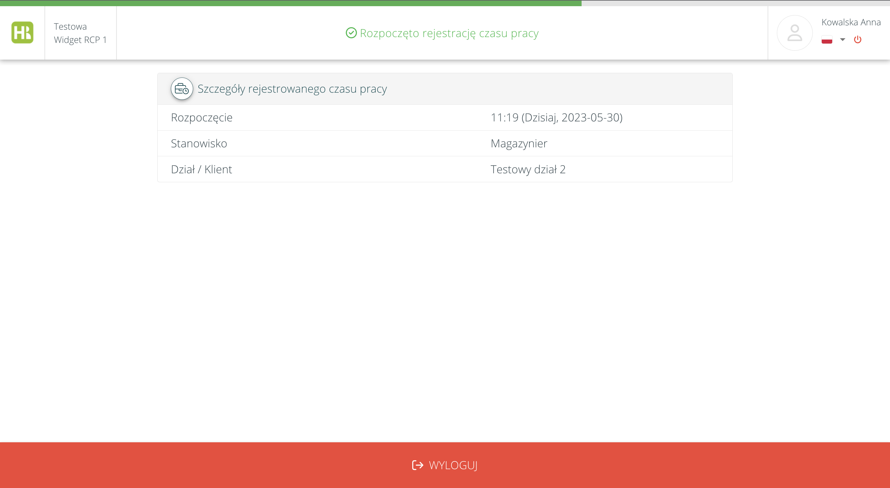 • Zielony pasek na górze interfejsu pokazuje ile czasu zostało do automatycznego wylogowania pracownika. Po wylogowaniu, czas pracy będzie się rejestrował do czasu zakończenia rejestrowania czasu pracy.