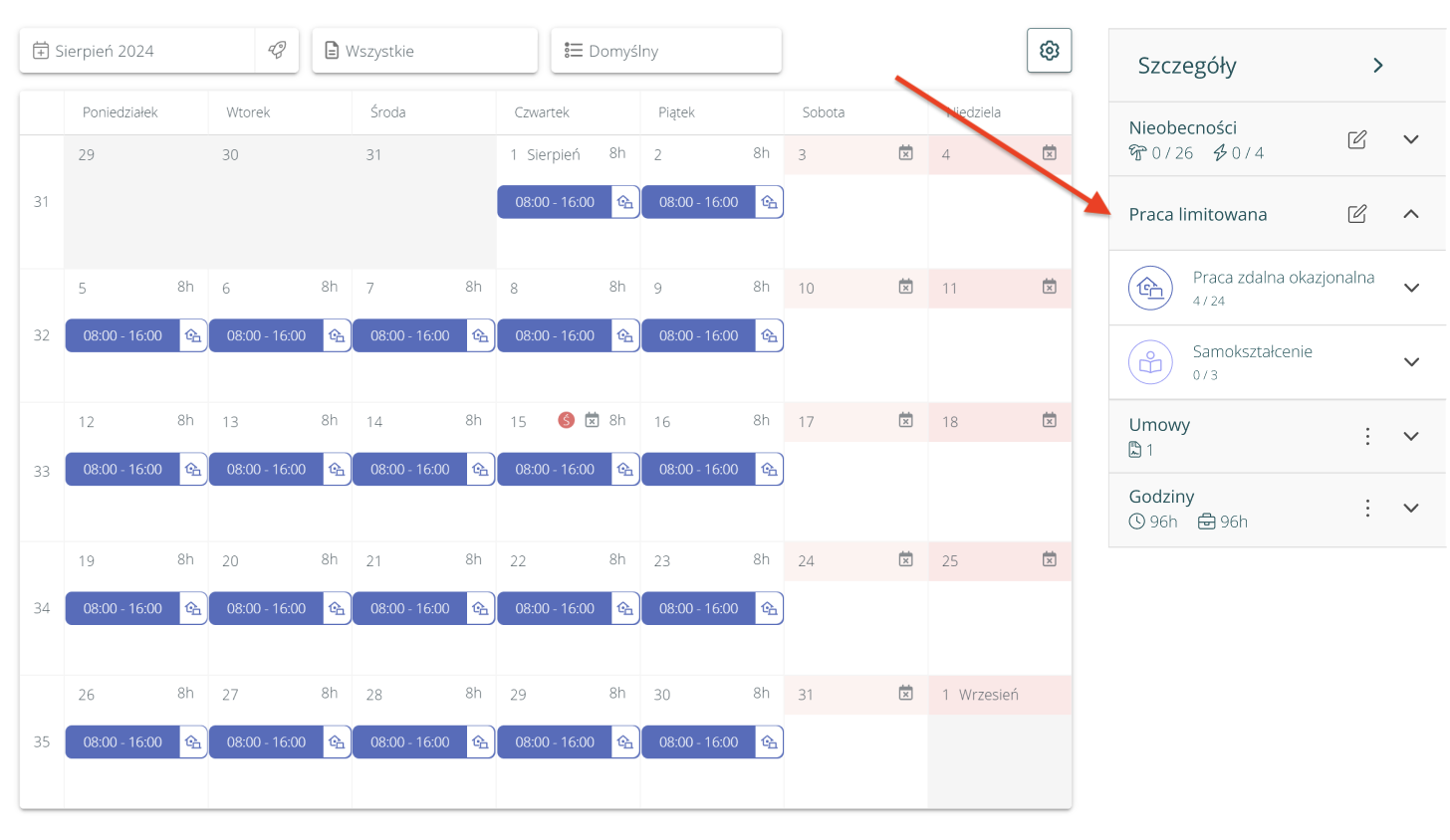 Poza obsługą własnych rodzajów nieobecności/pracy i pracy zdalnej okazjonalnej, zmiany widokowe dotyczą prezentacji panelu bocznego. Zmodyfikowana zostanie zakładka Nieobecności oraz dodana nowa – Praca limitowana:
