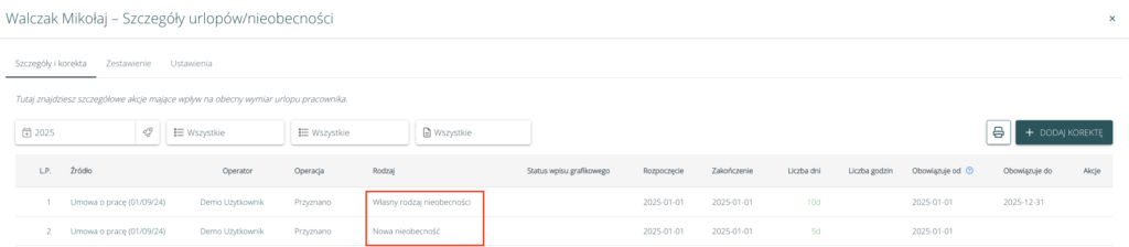 • wiersze operacji (np. powiększające stan) dotyczące własnych rodzajów nieobecności