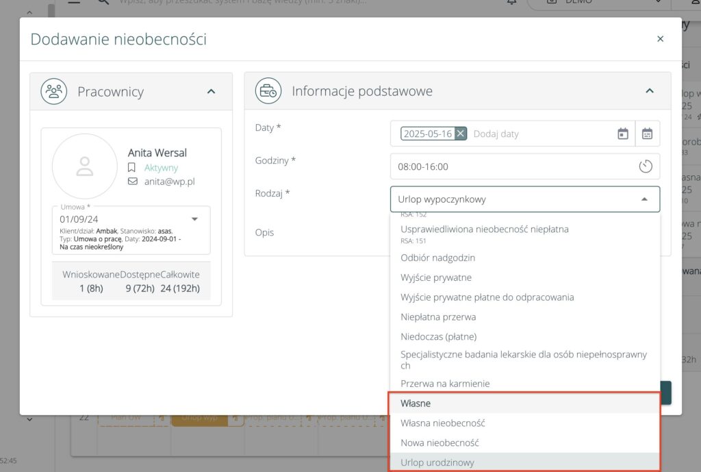 Podczas dodawania/edycji nieobecności, na liście dostępnych wartości pola Rodzaj dodamy nową kategorię – Własne. W nowej kategorii wylistowane zostaną wszystkie aktywne i dostępne dla wybranego pracownika własne rodzaje nieobecności: