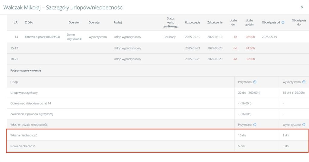 • podsumowanie własnych rodzajów nieobecności (Przyznano/Wykorzystano):