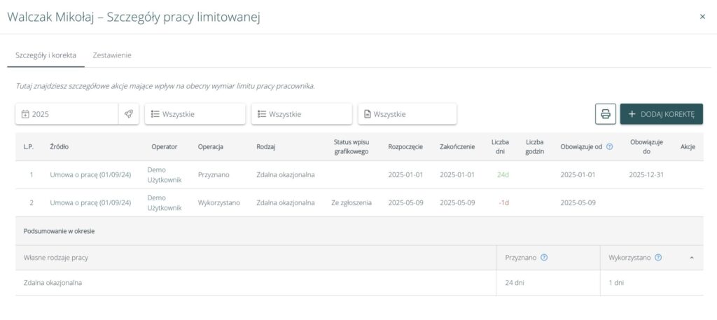 • W zwiniętej zakładce pokazujemy ilość wykorzystanych i dostępnych dni pracy zdalnej okazjonalnej