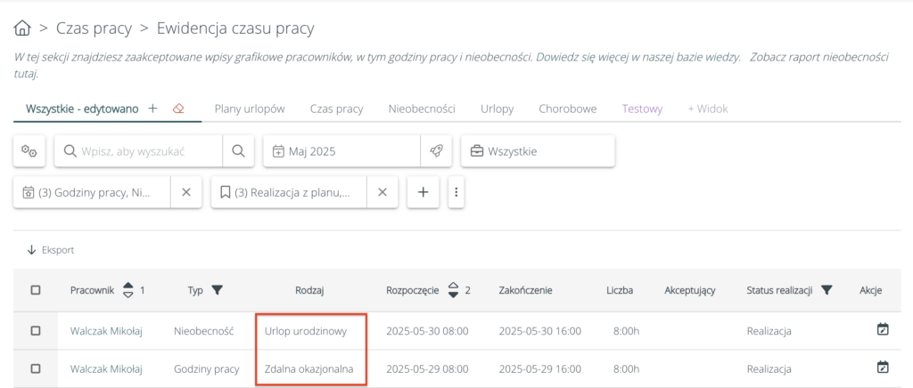 • Własne rodzaje nieobecności i pracy