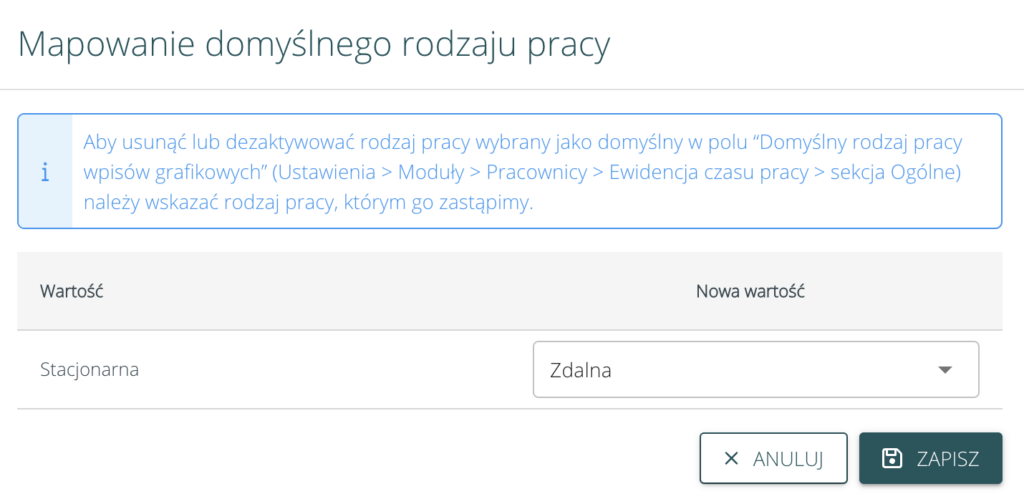 • domyślnie stworzone i włączone zostaną wszystkie typy pracy, które były wcześniej dostępne w systemie, czyli praca stacjonarna, praca zdalna, delegacja służbowa