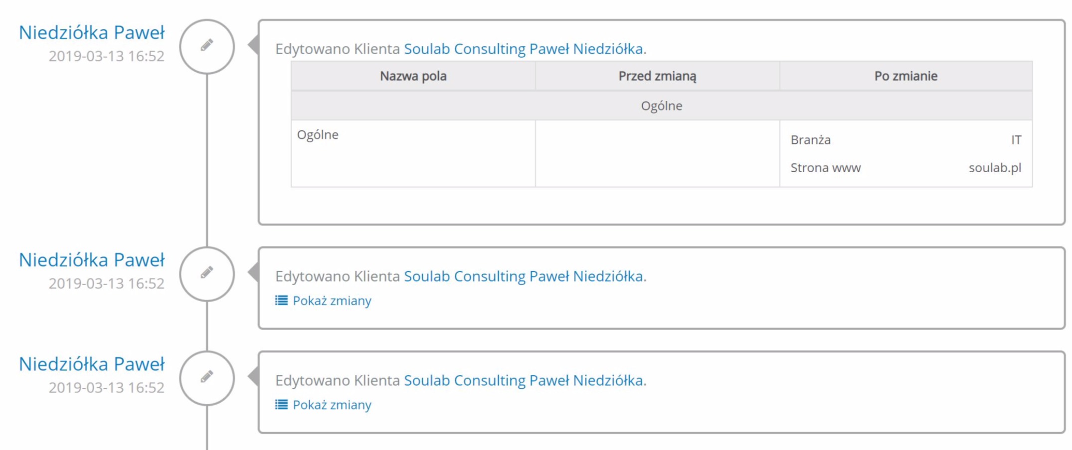 W HRappce zapisywana jest pełna historia edycji profilu Klienta. Dzięki temu możesz sprawdzić kto, kiedy i jakie dane dodał lub edytował.