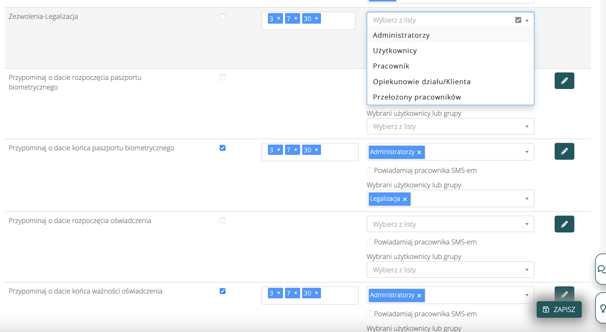 Każde powiadomienie z osobna (lub całą kategorię powiadomień) można przypisać do konkretnych użytkowników lub grup w systemie lub do osób z konkretną rolą (np. administrator, użytkownik).