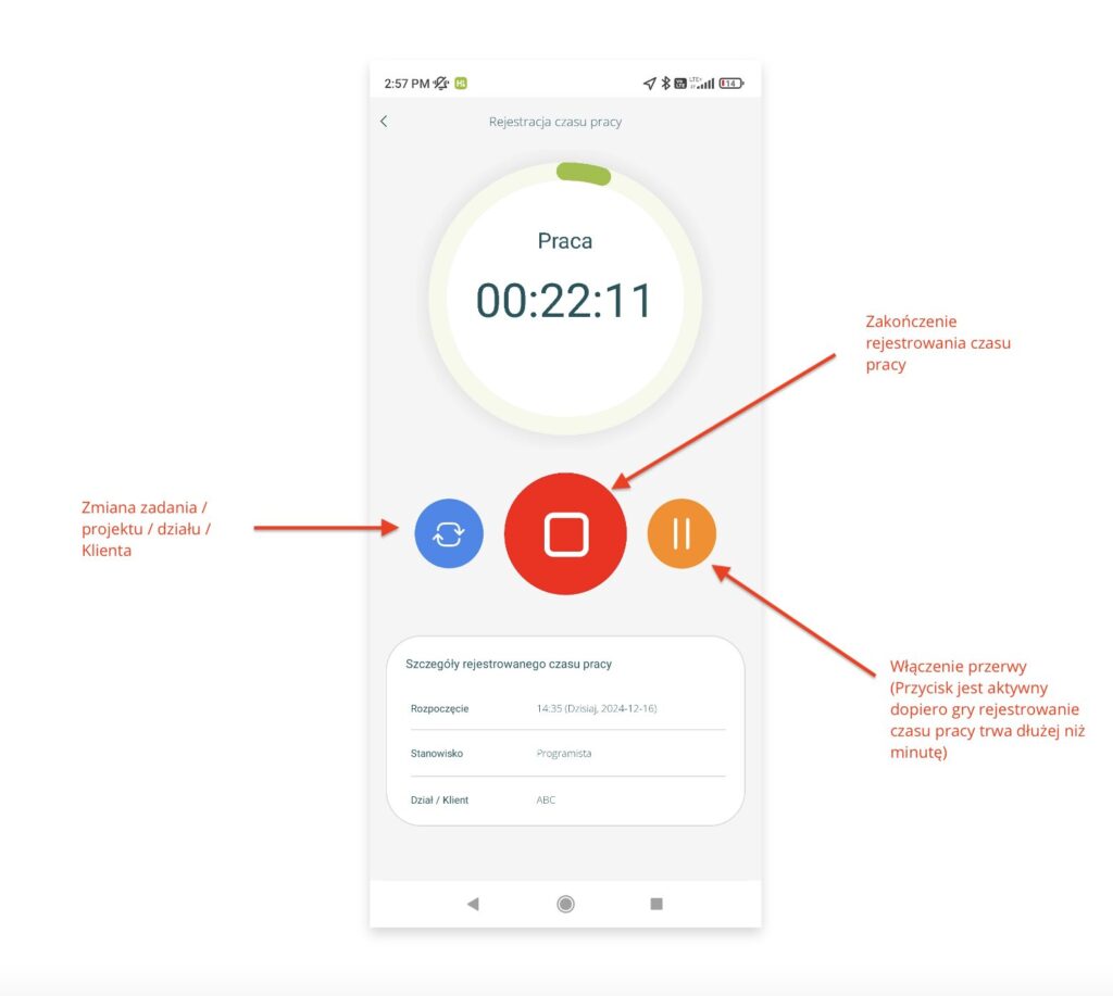 - Zakończenie pracy: Kliknij ikonę stop (czerwony przycisk), aby zakończyć rejestrowanie czasu pracy.