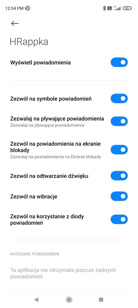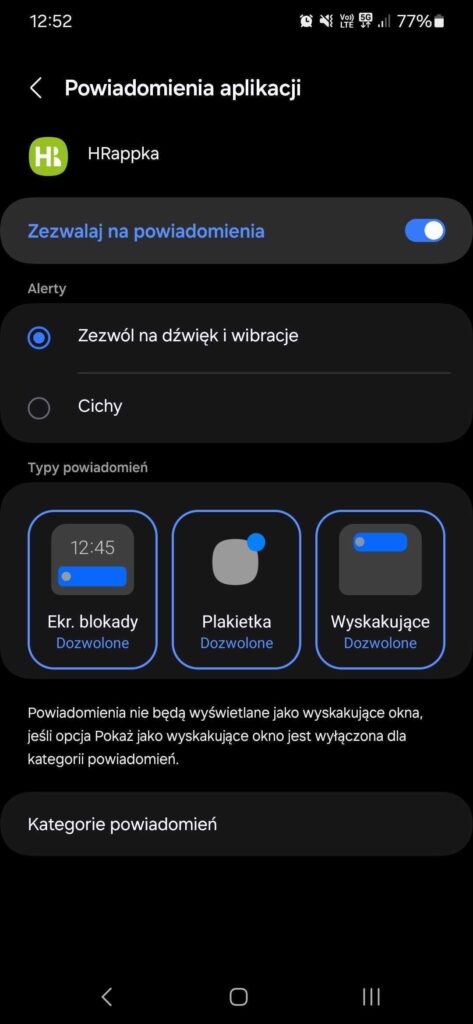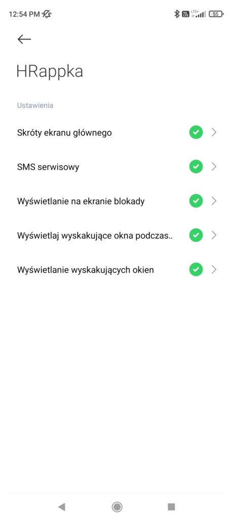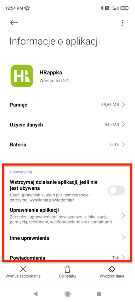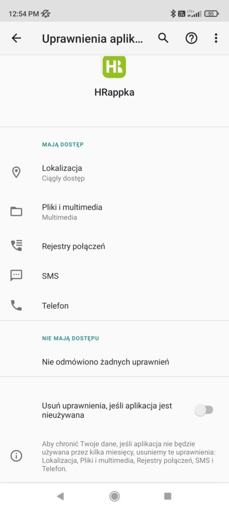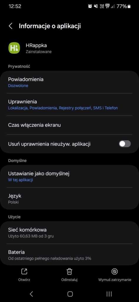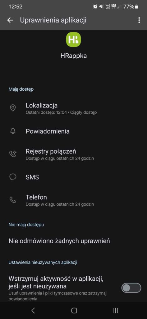 Należy przejść do Ustawień > Aplikacje, wybrać aplikację HRappka i ustawić poniższe uprawnienia.