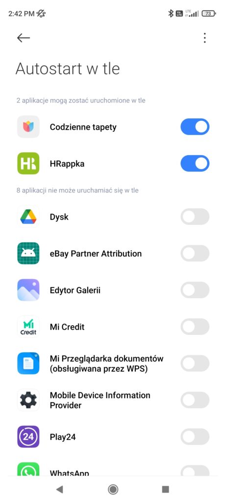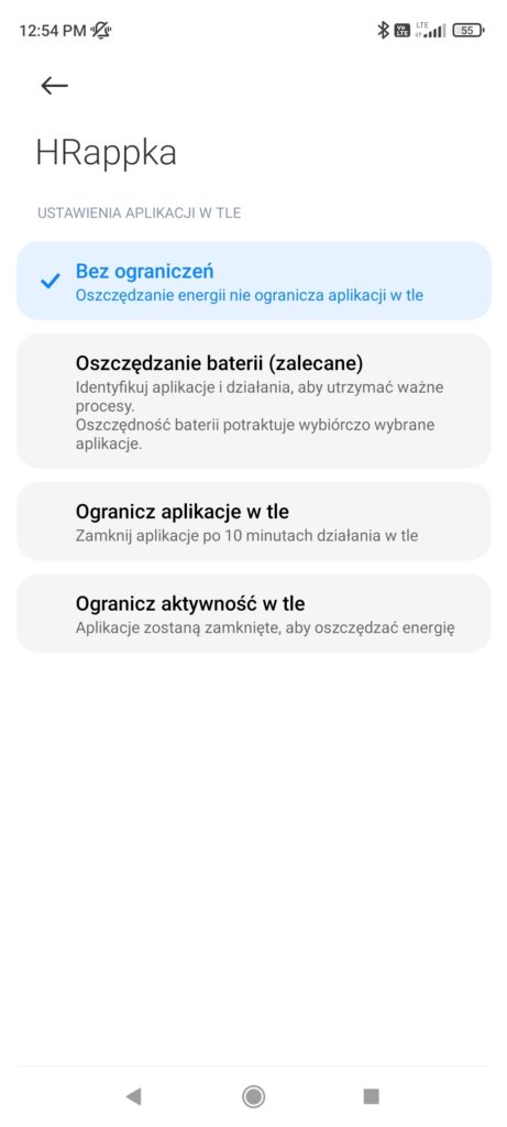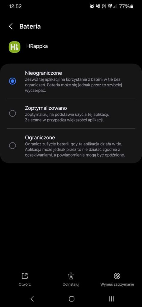 Należy przejść do Ustawień > Aplikacje, wybrać aplikację HRappka i ustawić poniższe uprawnienia. Uprawnienie do działania w tle należy ustawić w Ustawieniach w zakładce Autostart w tle: