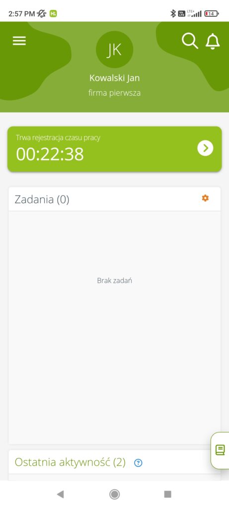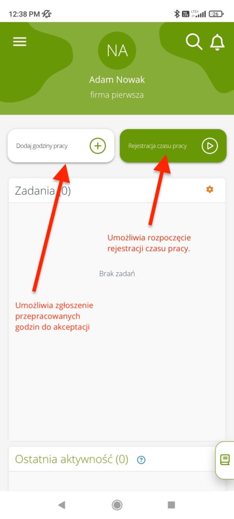 - Korzystanie z aplikacji mobilnej – Pracownik musi używać aplikacji mobilnej, aby przycisk pojawił się na jego dashboardzie. Przyciski nie są jeszcze widoczne w wersji przeglądarkowej.
