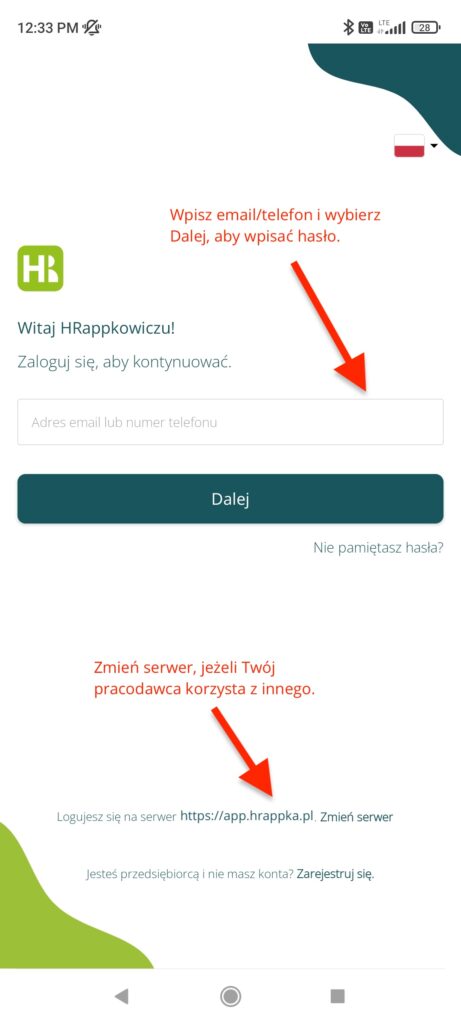 Jeżeli firma w której pracujesz ma system na własnym serwerze – kliknij Zmień serwer i wpisz adres serwera, z którego korzysta twoja firma. Domyślny serwer dla większości firm to https://app.hrappka.pl.