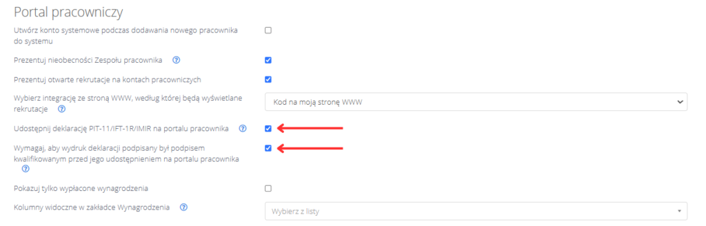 • Istnieje możliwość blokady wyświetlania deklaracji na portalu pracowniczym, jeżeli nie jest ona podpisana podpisem kwalifikowanym. Opcja „Wymagaj, aby wydruk deklaracji podpisany był podpisem kwalifikowanym przed jego udostępnieniem na portalu pracownika” dostępna jest w Ustawieniach > Moduły > Pracownicy w sekcji „Portal pracowniczy”. Domyślnie opcja ta jest wyłączona.