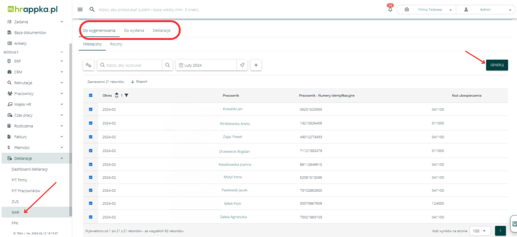Aby wygenerować deklarację IMIR, należy przejść do zakładki Do wygenerowania, i zaznaczyć pracowników, którym chcemy wygenerować deklarację. Nad listą uaktywni się przycisk GENERUJ. Kliknięcie tego przycisku otworzy okno modalne z formularzem generowania deklaracji IMIR, w którym użytkownik będzie mógł potwierdzić generowanie deklaracji. Wygenerowane deklaracje pojawią się w zakładce „Do wysłania” oraz „Deklaracje”.