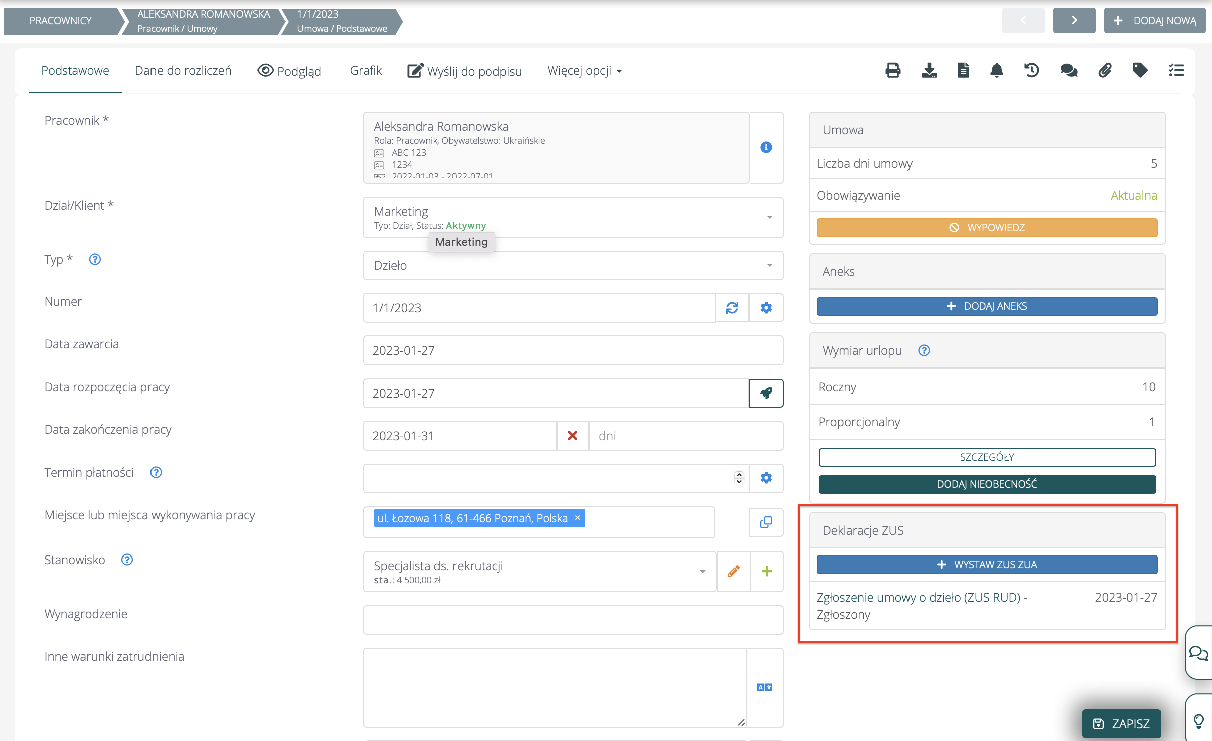 Kiedy dane w formularzu zostaną zapisane (przycisk “Zapisz” znajduje się na dole formularza), to na umowie, która była zgłaszana w sekcji “Deklaracje ZUS” pojawi się informacja o zgłoszeniu: