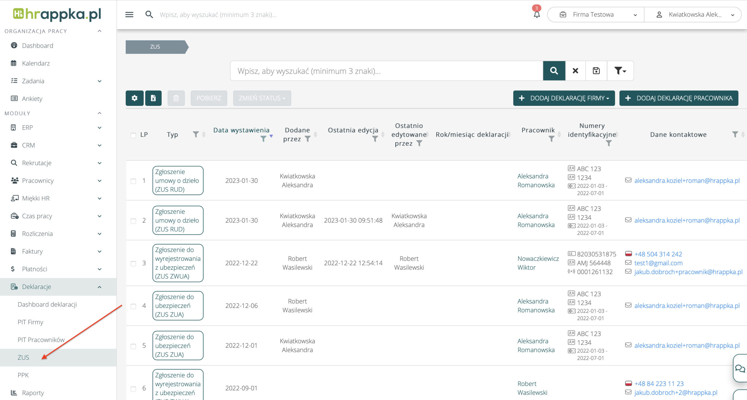 Wszystkie wygenerowane deklaracje w systemie znajdziesz w module Deklaracje > ZUS.